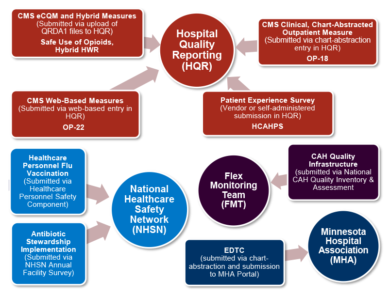 The MBQIP Minnesota Quality Reporting Guide and MBQIP Data Submission Deadlines are key resources to help CAH staff understand the MBQIP reporting processes. For each reporting channel shown in the chart below, the reporting guide includes information on how to register and instructions for collecting and submitting data.